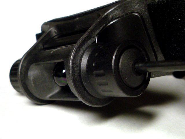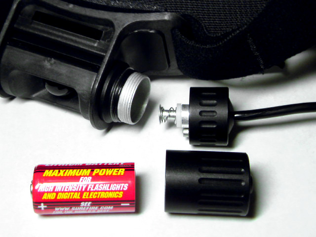 Minimus Vision runs on a single 123A battery contained within the left-hand tilt-control knob, and the battery access cap features a short leash to prevent loss.