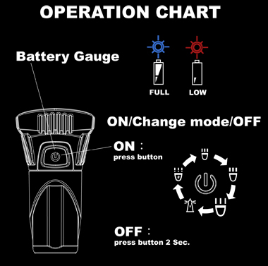 • Three types of flashing mode: Strobe, SOS, Warning flash
