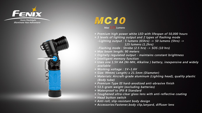 Fenixの好評単3x1本、Golden Dragon LED搭載、Max125Lumensのアングルライト、MC10若干数最入荷しております。