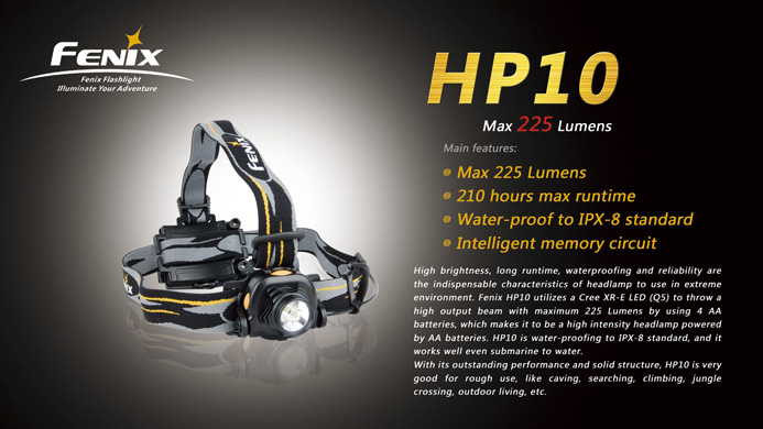 フェニックス社初のヘッドランプ、FENIX HP10は、Cree XR-E LED Q5bin x テクスチャードリフレクター搭載、単3アルカリ乾電池を4本使用、Max225ルーメンズのハイパワーLEDヘッドランプです。