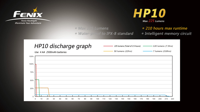 --Lighting mode: 7 lumens (210hrs) -> 50 lumens (22hrs) -> 120 lumens (7.5hrs) -> 225 lumens (Max2.5hrs)