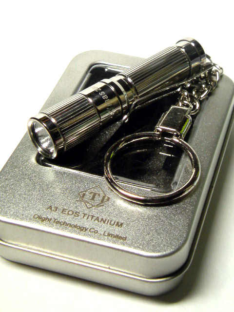 iTP A3 EOS TITANIUMは、チタンボディー、Cree XP-E Q5bin LED x Textured Reflector搭載、Max 80ルーメンズ、1AAA、ツイスト操作による3モード調光の小型キーチェーンハイパワーLEDフラッシュライトです。