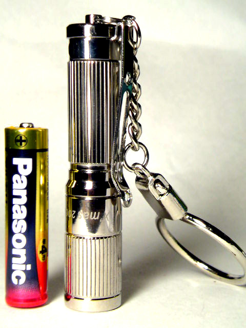 Cree XP-E搭載、単4アルカリ1本でMax80Lms.、3モード調光、好評小型ハイパワーLEDキーライトのステンレスバージョン。化粧箱付。